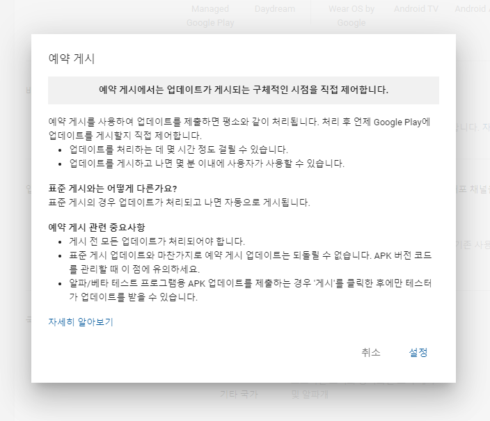 새로운 구글 플레이 콘솔에서의 예약 게시