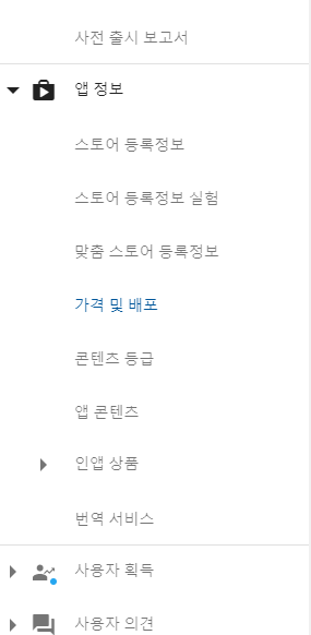왼쪽의 네비게이션에서 앱 정보 > 가격 및 배포 로 들어갑니다.